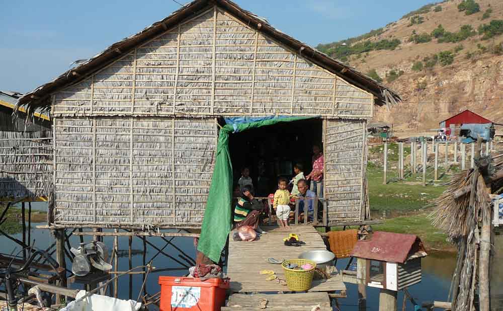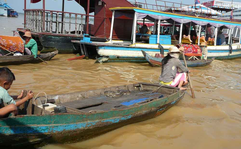 高床式の家々が立ち並ぶ村を訪れ、アジア最大の湖、トンレサップ湖