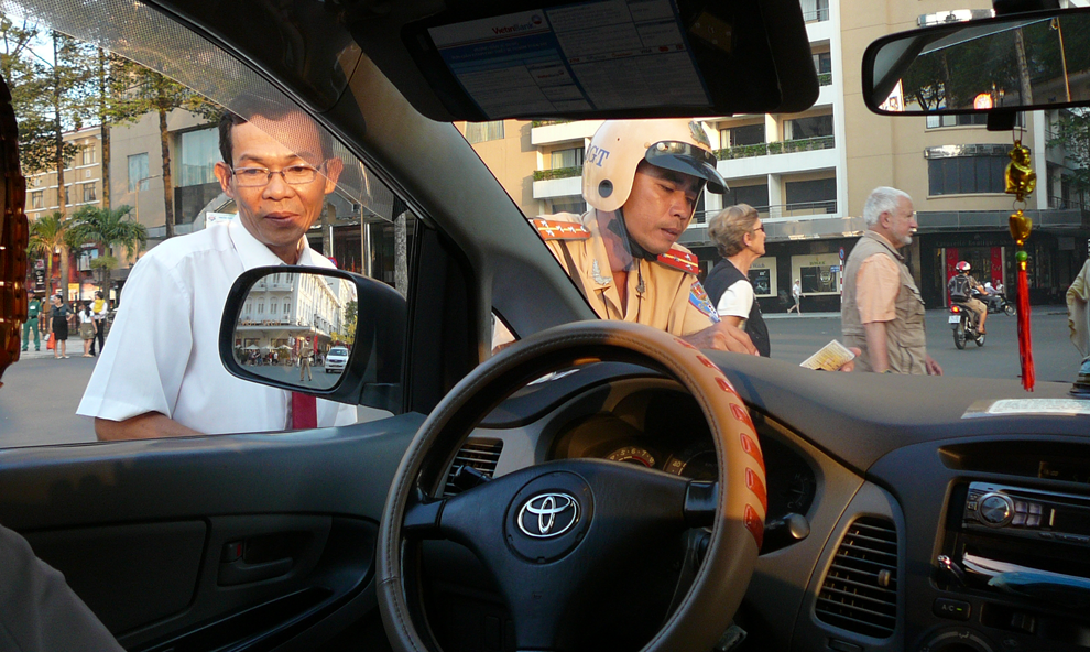 明日乗車する列車の切符を買うため、タクシーでサイゴン駅に向かう途中、交通違反で捕まってしまいました。