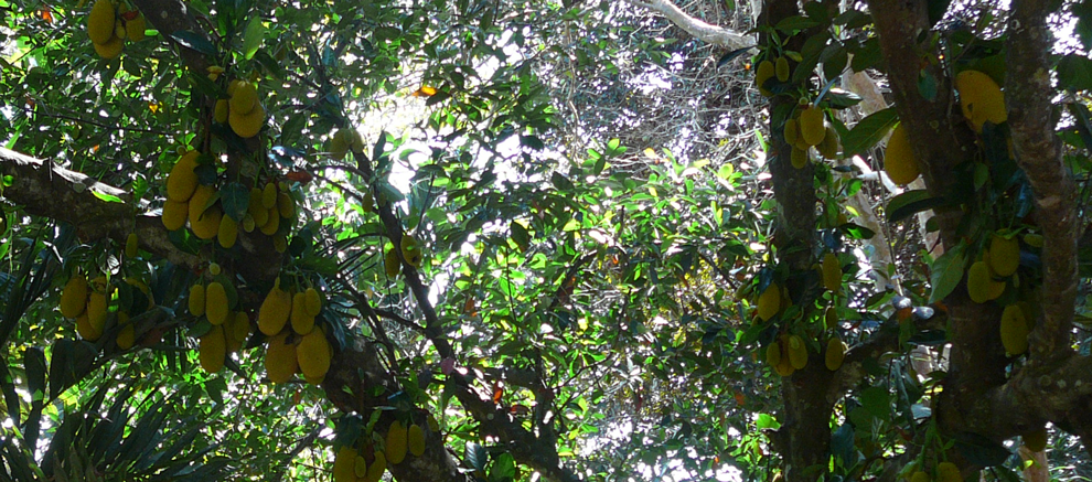 森には、世界最大の果実といわれる「ジャックフルーツ (ベトナム語で ミット/Mit) 」長さ70cm、幅40cm、重さ40-50kgに達することもあります。