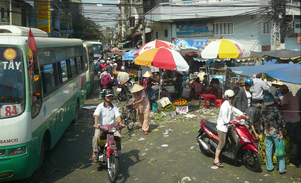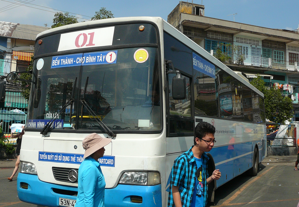 チョロンへは、ホーチミン1区「ベンタイン市場」向かいにあるバスターミナルから1番バスに乗車、終点「ビンタイ市場」で降ります。所要時間 30~40分。