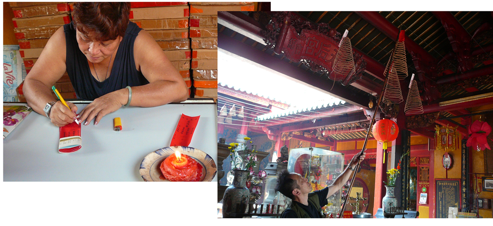 拝殿の頭上には、螺旋状の線香が何十と吊るされ、中国文化が根に張っていることを現しています。