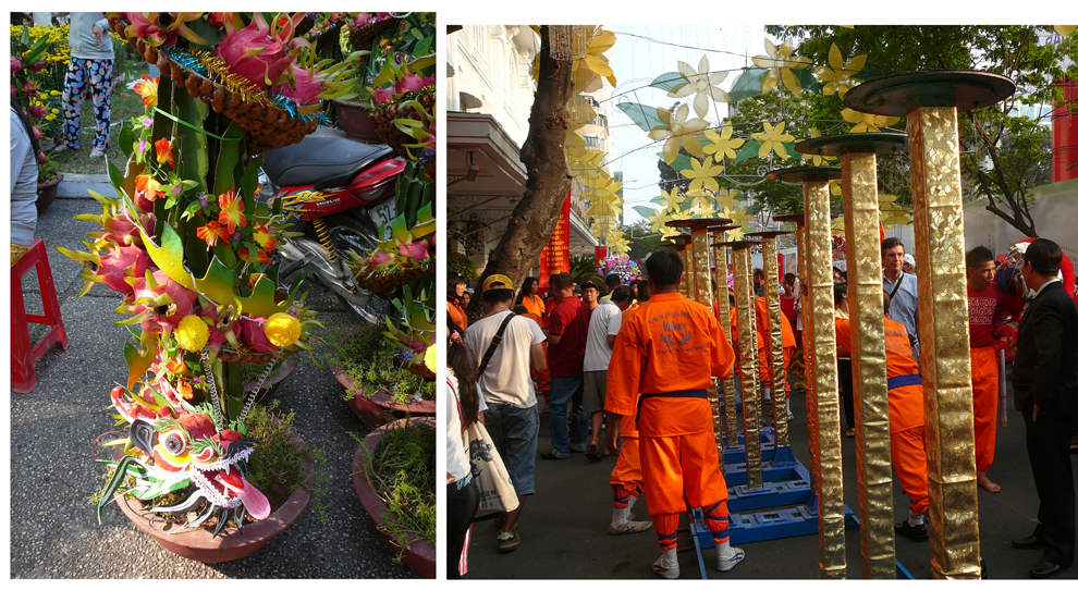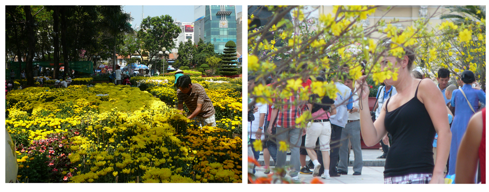教会前の庭園では、旧正月の飾りつけ用に花市が開かれて華やか。