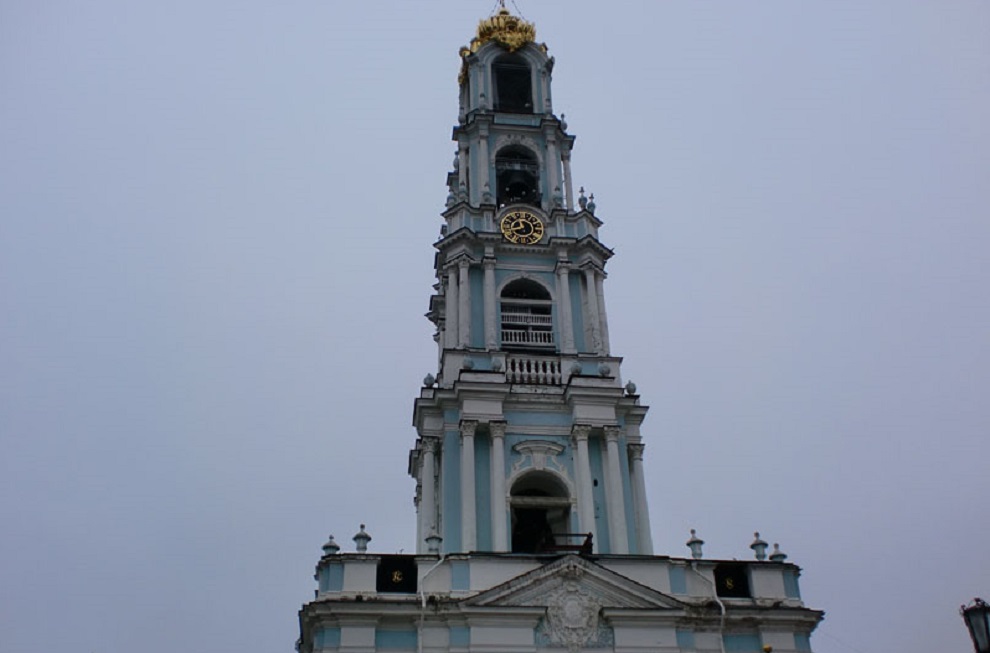 ここセルギエフ・ポサードの聖堂の外観は、キリストをあらわす金色屋根を中心に、周囲に聖母マリアをあらわす青色屋根が配された、とてもポップな色合い。絵本から抜け出したお城のようなこの聖堂、クレムリンのウスペンスキー大聖堂を模したものです。