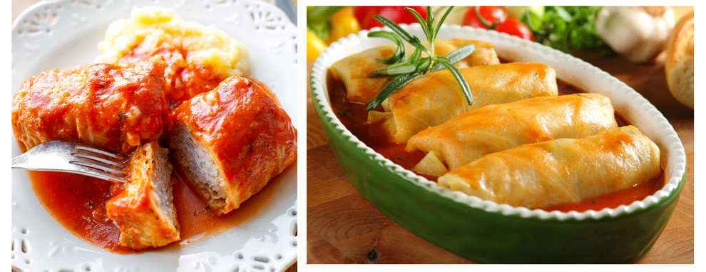 ゴウォンプキ (Gołąbki) はロールキャベツの一種で、gołąbek (鳩) の複数形を意味します。料理の形が名の由来で、鳩肉が使われている訳ではありません。