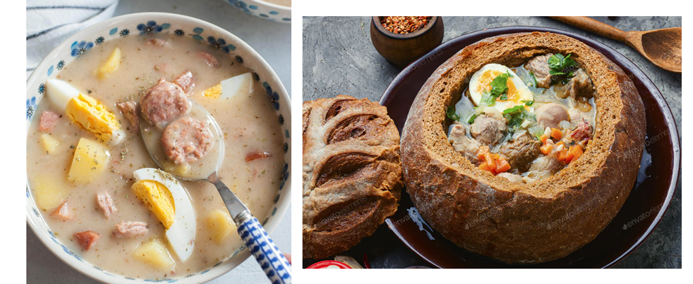くり抜いたパンの中に入れて供されることもあります。(Polish soup zurek in bread pot)
