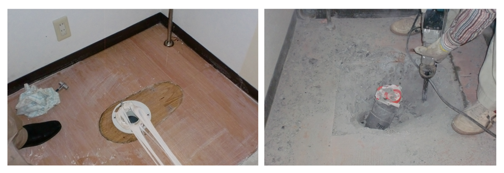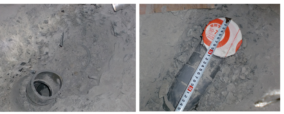 便器を外した後、排水管周囲のコンクリートを、はつります。