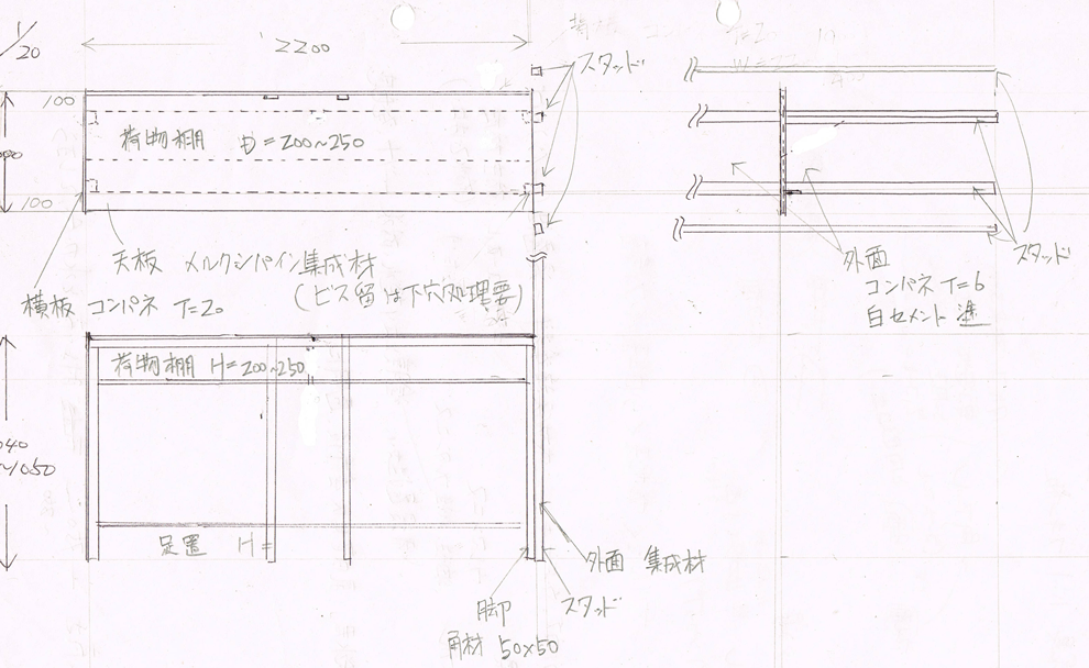 膝回りが当たらないようにするためには高さも 200mm が限界で、収容力は低く、「ないよりも、あれば便利」程度の棚でした。