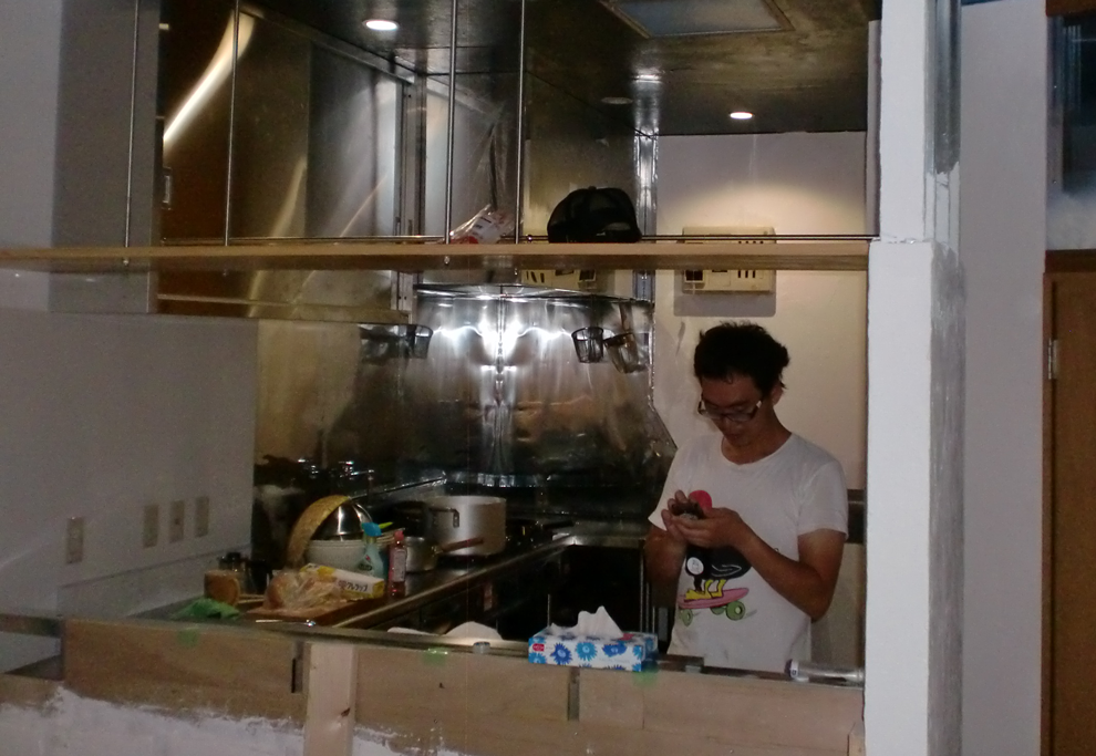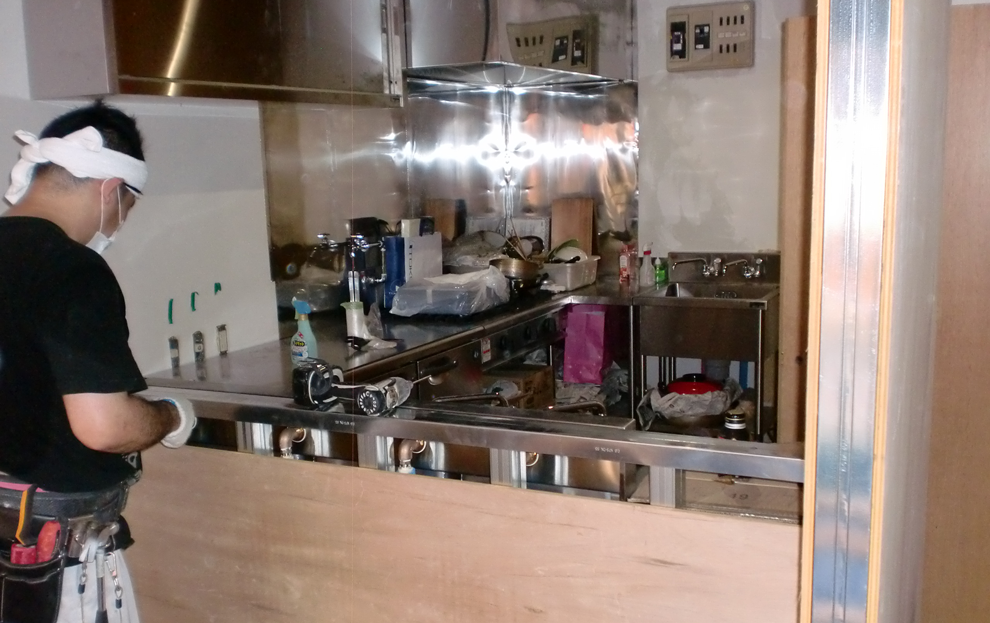 カウンターを支えるスタッド (銀色の軽鉄材) を立て、ベニヤ板でカウンター下部を覆います。