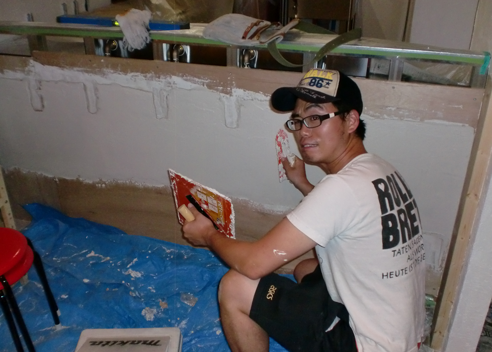 漆喰は見た目は上品で良いのですが、実際に使用してみると、酔ったお客さんが無意識に壁を蹴って靴汚れが付いたり、場合によってはポロリと剥げてしまったりで、物が当たる部分にはビニールクロスを張った方が良かったと、後で思いました。