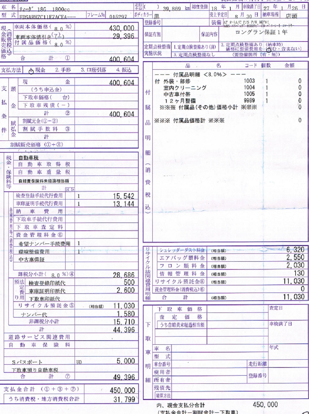 中古車を購入しました。走行距離 39,869kmでコミコミ 450,000 でした。