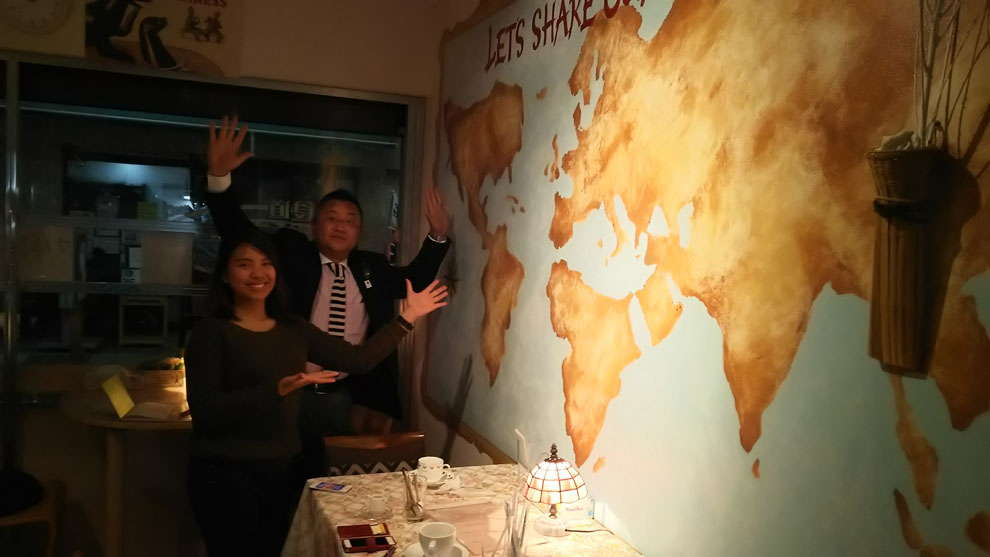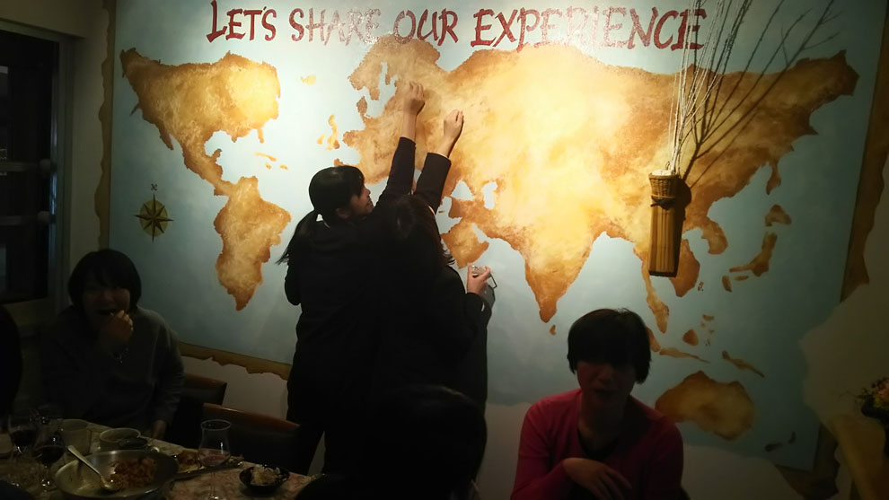 完成した壁画をバックに開いた宴会。お客様が楽しそうに、旅行したことのある国にピンをさしてくれました。