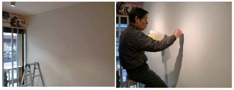 原稿にマス目を入れて等分割してから、壁にも同じ数のマス目を書きます。マスごとに原稿から壁へと、拡大複写の要領で下書きします。