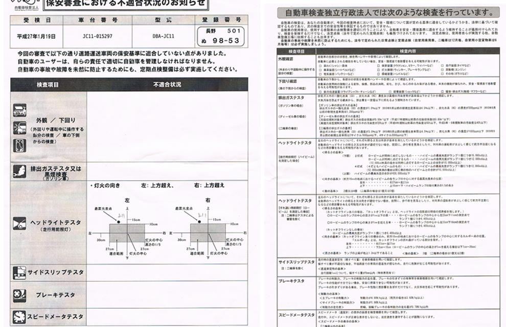 検査の結果、「ヘッドライトが左右とも、中心点から左上11mmに、光軸がはみ出している」との指摘を受け、不合格。