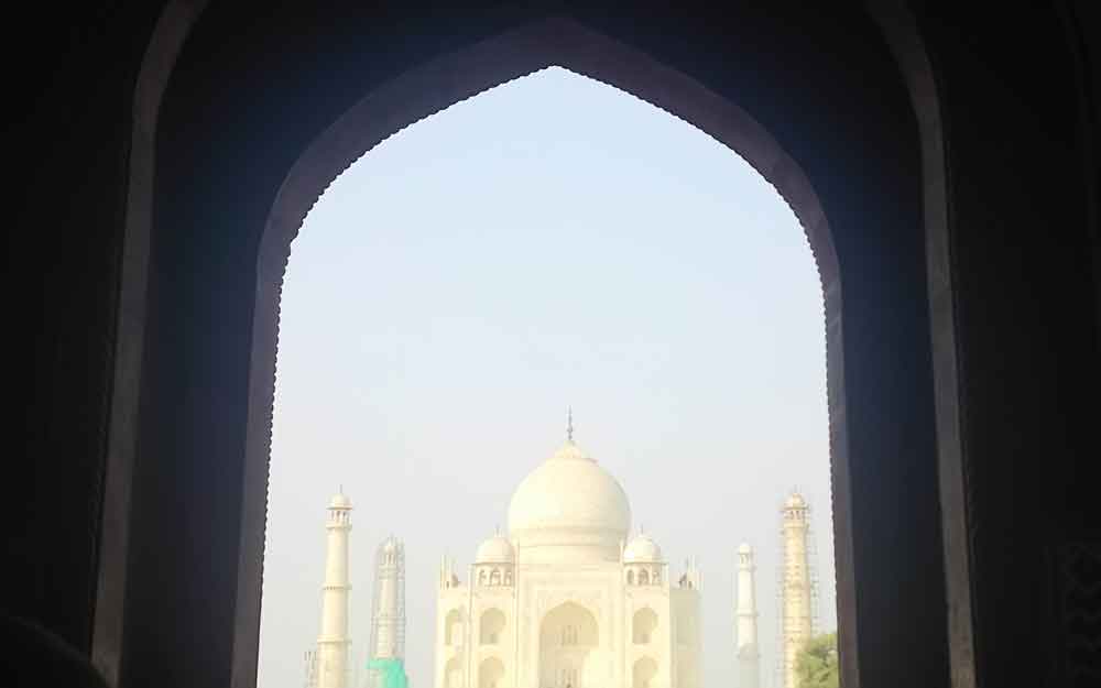 正門出口いっぱいにタージマハルが、4本のミナレット(尖塔)に囲まれている。