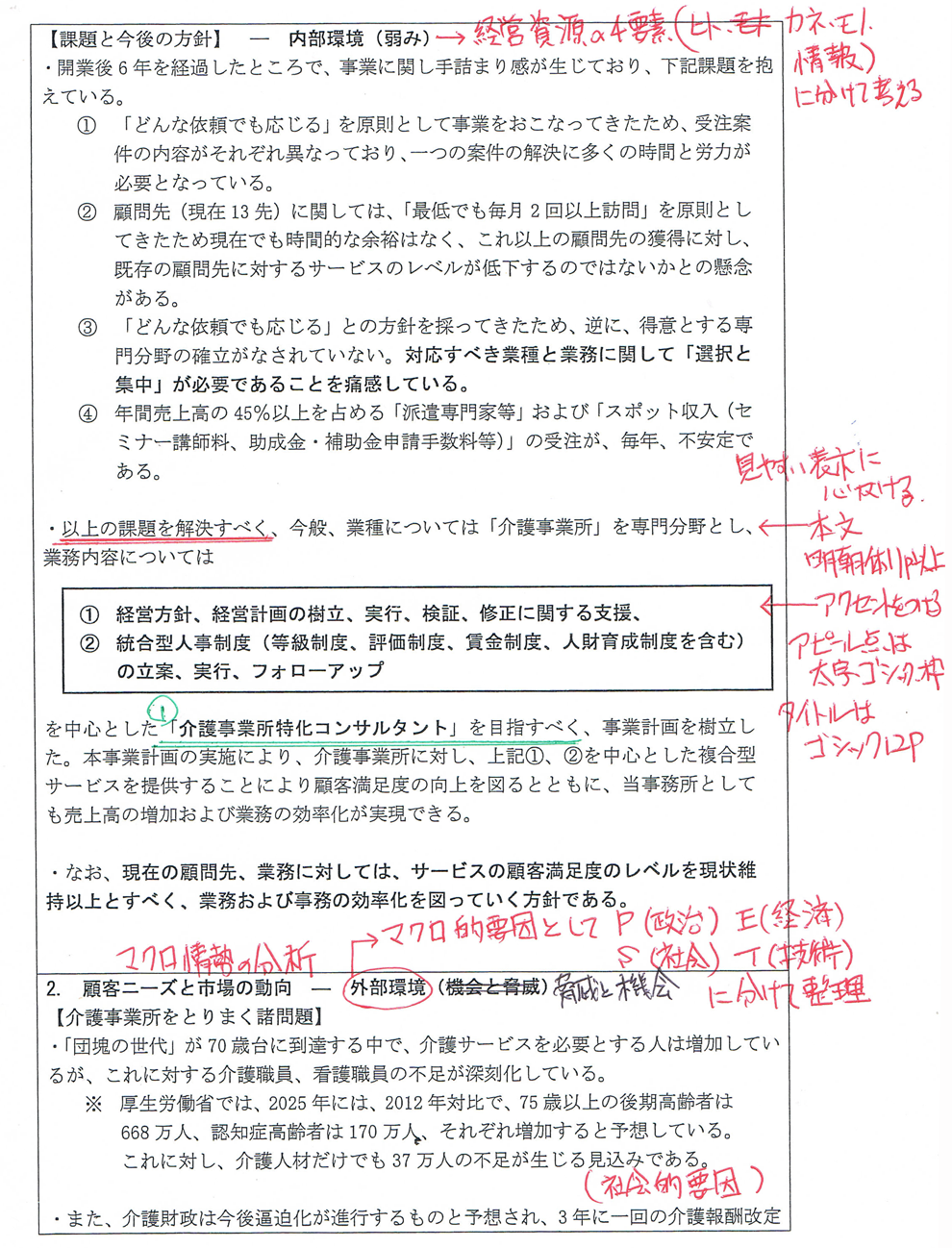 企業というものは、時代の流れや社会情勢などに対応しながら事業を営まければならないので、外部環境も検討すること。