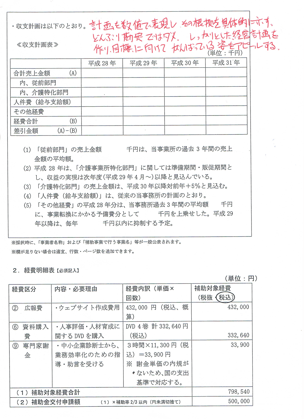 この補助金の申請書を書いていていつも頭を悩ますのは、様式2に「今後の方針」「今後のプラン」と記載する欄があるうえ、様式3で新たに「取組内容」を記入することになっており、内容がダブってしまう点です。(上記記載例、緑線の表示)