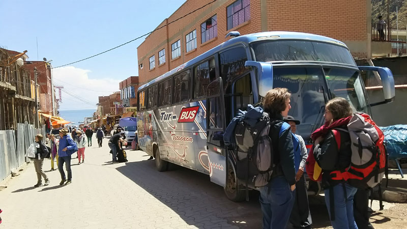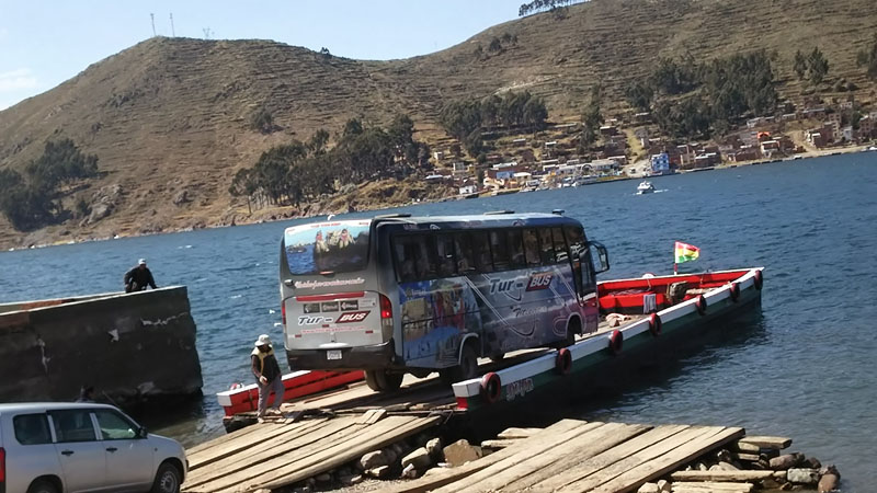 ラパスへ向かう道路は途中、ティティカカ湖とウイニャイマルカ湖を結ぶ幅0.5kmほどの水路で分断されており、ここはバスを降りて渡し舟で渡ることになる。