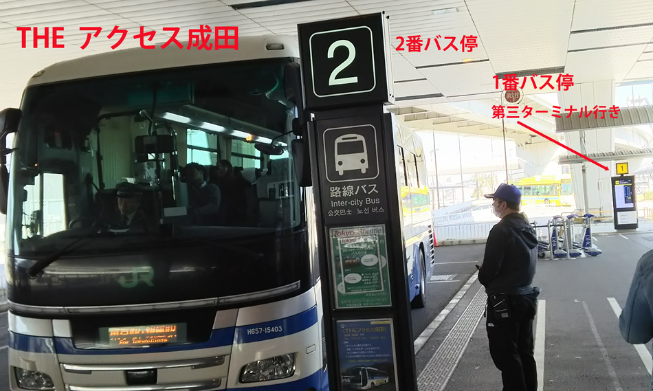 バス停で待っていると「東京シャトル」とは別の、東京駅・銀座駅と表示された「アクセス成田」というバスが入線してきました。