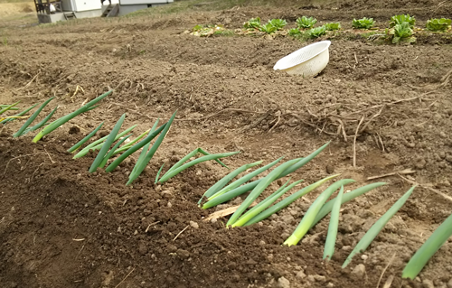 一列に並んだネギたちは、肩までゆっくり温泉に浸かっているみたい。私だったらこのまま寝そべって過ごしたいと思うのですが、本当に立ち上がってくるんでしょうか。土寄せと追肥を繰り返して1~3ヶ月栽培すると、土のかかった部分が柔らかくなるということで、ゴールデンウイーク明けが楽しみです。