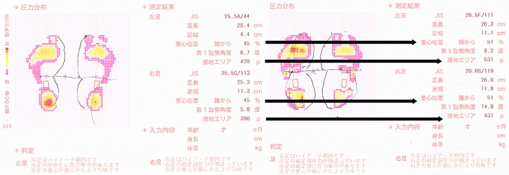 私の足は「ハイアーチ傾向」(甲高な状態の足。偏平足の逆) ということで、「接地エリア」が少なかったのですが、それも改善されています。