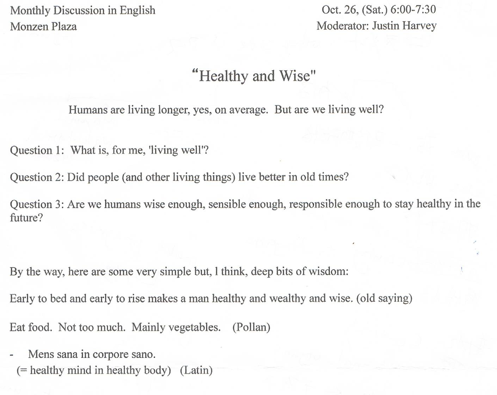 英語で討論会「Monthly Discussion in English」今日のテーマは「健康を保つ秘訣」