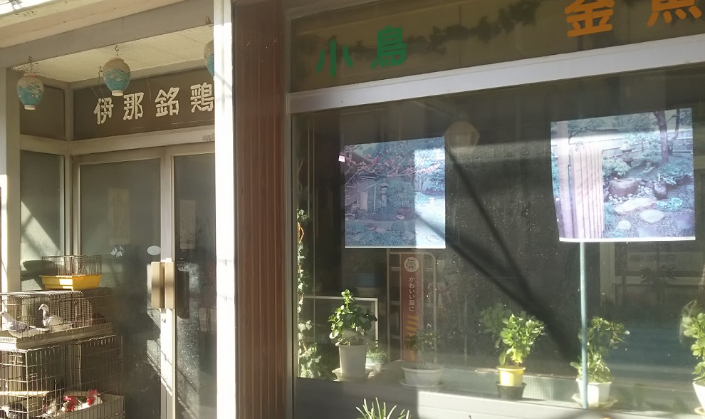 店内に「かわいい猫に」との看板が見えます。金魚や小鳥を売る店で、天敵である猫の餌まで販売しているとは。ペットショップだからいいのか。