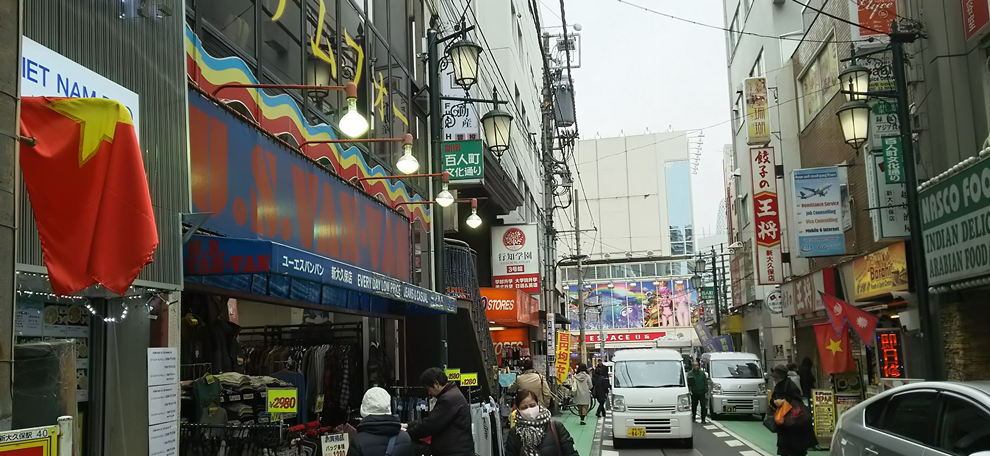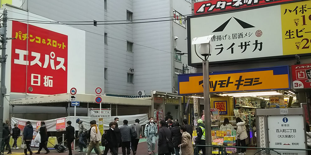 コリアンタウンから大久保通りを西に向かい、JR山手線をくぐり抜けて右手にある「マツキヨ」を右折すると、いきなり異国の雰囲気に包まれます。