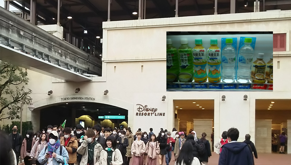 「JR舞浜駅」「ディズニーランド」「ディズニーシー」ホテルエリアの「ベイサイド」の4駅を、モノレールの「ディズニーリゾートライン」が結んでおり、ディズニーシー駅てはたくさんのコインロッカーが設置されています(写真右奥) 。自販機のペットボトルは200円と、ややリゾート価格です。
