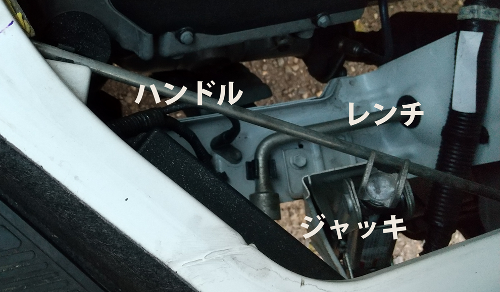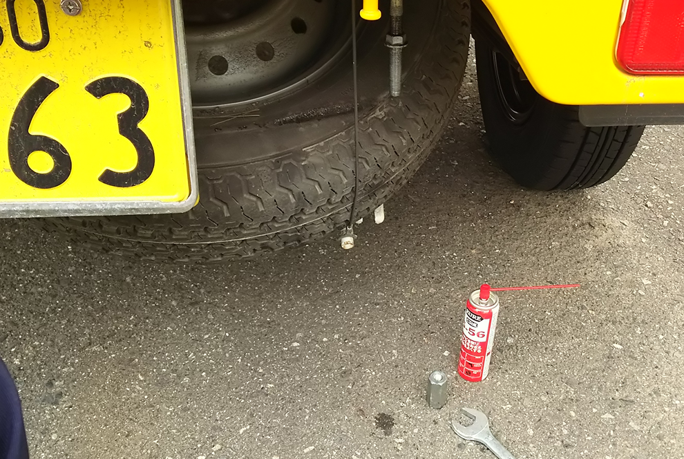この際、スペアタイヤの空気圧もチェックしようと思い、荷台下部から外そうとするのですが、六角ナットが緩みません。締め過ぎです。おそらく前所有者が、トルクレンチではなく、インパクトレンチで締め上げたのでしょう。