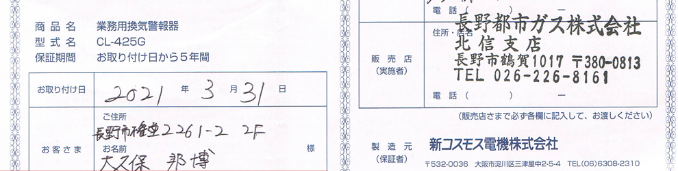 本日、取り付けてもらった警報機の保証書です。