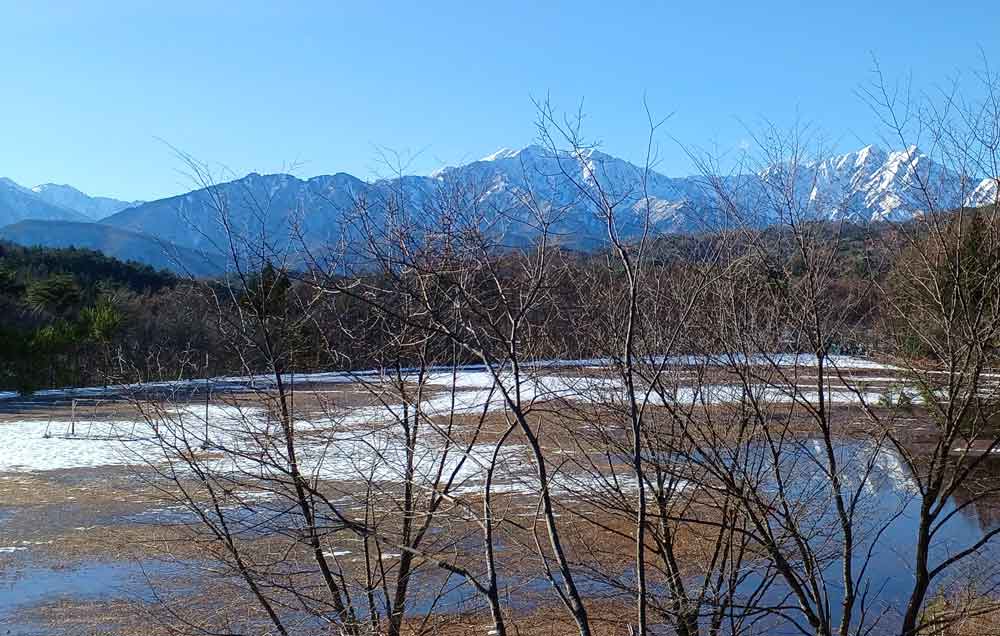 一転して晴れ渡った今日、いっせいに溶けた雪が、隣地のグランドを満たし、さながら湖のようになった。