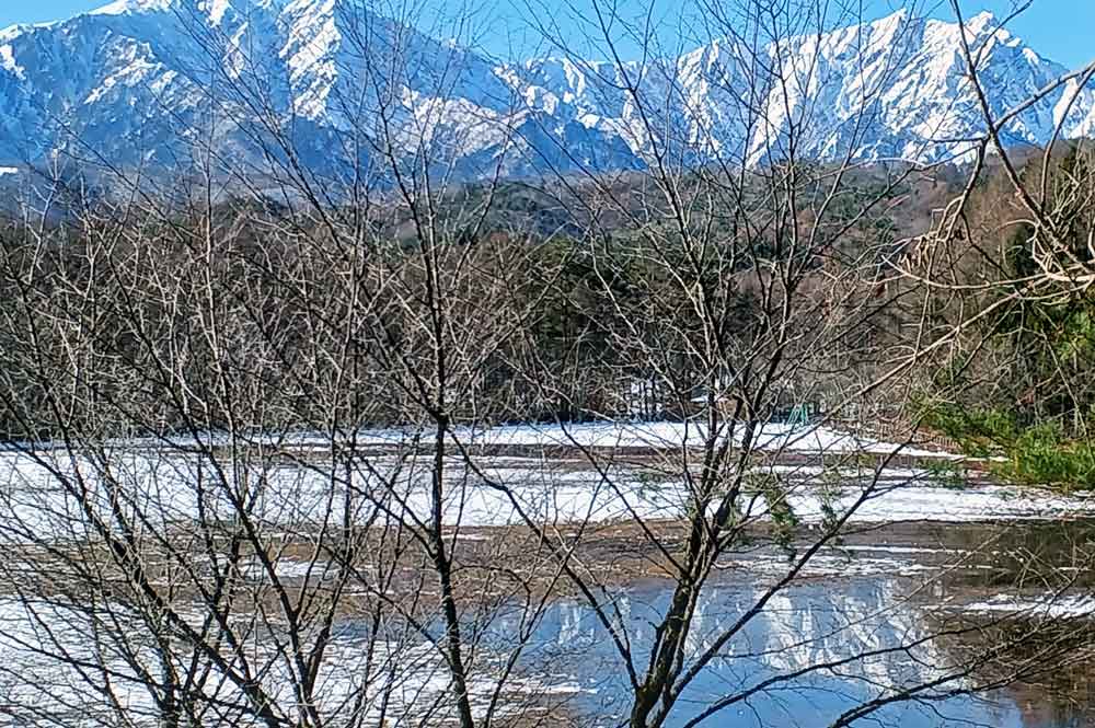一転して晴れ渡った今日、いっせいに溶けた雪が、隣地のグランドを満たし、さながら湖のようになった。