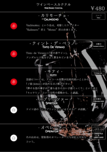 カクテルメニュー スクリュードライバー ¥ 480 ウォッカ + オレンジジュース アップルウォッカ ¥ 480 ウォッカ + アップルジュース ワインベースカクテル ノンアルコールできます <クリックで拡大表示>