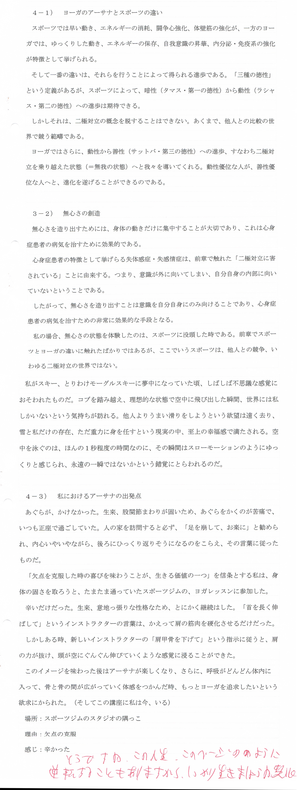 3)あなたが、 ヨーガのアーサナを実習し始めた理由と場所、 それにアーサナをし始めた時の感じをもう一度思い出して、それらを*場所、 *理由、*感じと分けて、箇条書きにしてみてください。